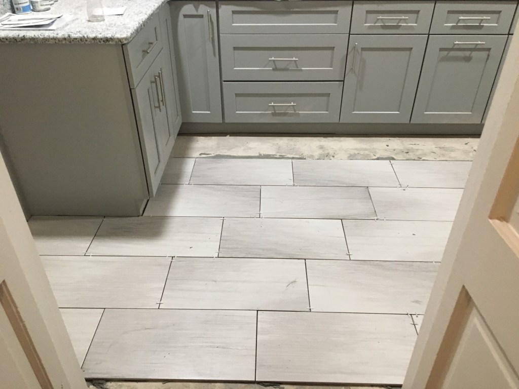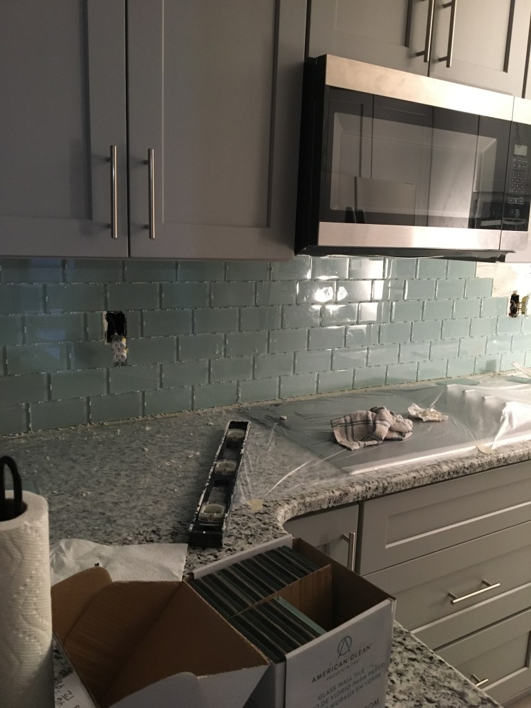 I seem better at finishing projects than posting about them. I now have several projects to post about and so will do my best to get caught up on all of those in short order. First off – wrapping up the kitchen. In a previous post, I had shown our before and mostly after of our kitchen. The last I showed we had not painted the room, didn’t have a backsplash, and didn’t even have a dishwasher or cooktop. For this quick post I want to show some more updated pictures of our kitchen. Our kitchen is by no means large and there are items I would do differently if I was redoing it now, but overall I am very proud of it. I chose a very light (basically white) gray – White Wisp. Our ceilings are only 8ft so it was important to me to make everything as light and bright as possible. I do love this color, but with time I have found it shows dirt and whatnot more than I would like so maybe a little darker would have been better. To not have everything be shades of gray I picked out a sea blue backsplash. The last picture looks like we did a terrible job of measuring tile, but this is behind the fridge so it is totally fine. We planned to go a little past the counter so the sheetrock wouldn’t show from behind the fridge. I now realize I never took a great after photo for once the grout was finished and all the residue cleaned up. I will have to get one and get it posted at some point. It is definitely a long ways from the yellow kitchen with terra cotta floors and 1970s cabinets!