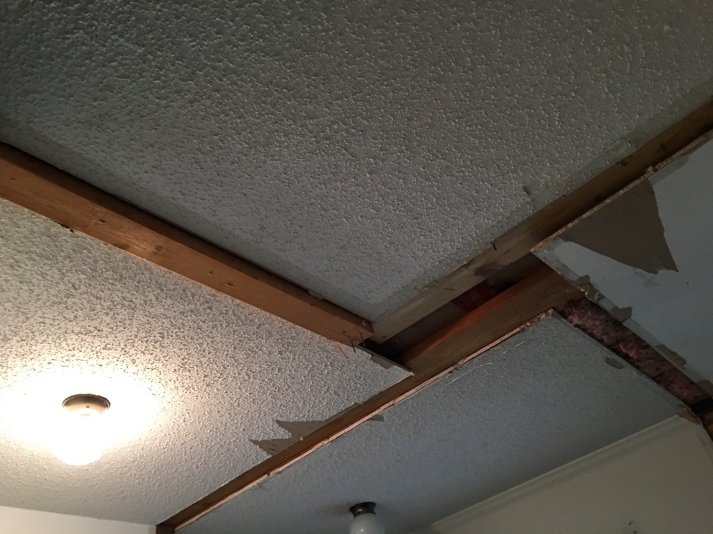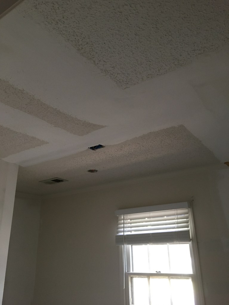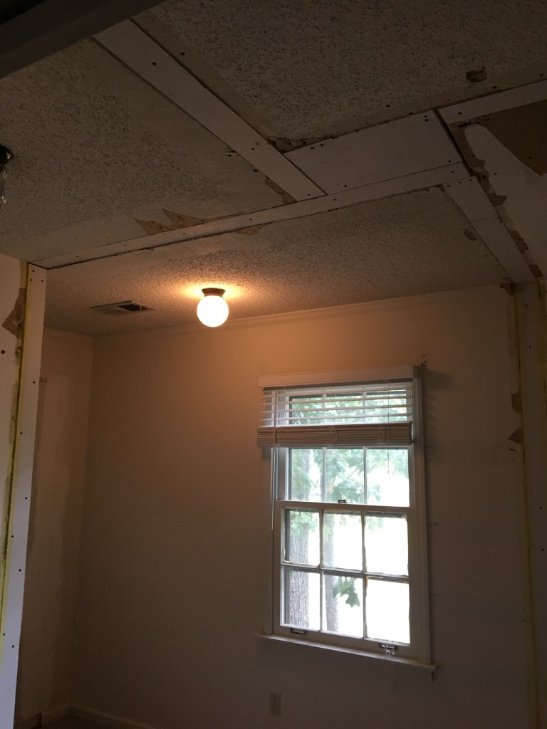 I feel it is often the case that beginnings go unnoticed. One won’t even realize they are experiencing a beginning at the time. My remodeling story starts much that way. Even now looking back I have had somewhat of an internal argument with myself when deciding where this story starts.  I think the most likely place it started was in our previous home. When we bought it the kids were 2 and 4. It was a 4 bedroom home and we planned to use one of those rooms as Chris’s office. That meant that if we had guests we would need to put them in one of the kids’ rooms. One of the non-master bedrooms was obviously the better choice. It was bigger and so could handle a bigger bed easier. Gray being the oldest was offered this room. Gray, being Gray, reasoned that if his room would be the guest room when people were in town meant he would have to give up his room sometimes. He was not on board with that and so said give the room to Clara. So Clara went from a crib to a queen sized bed with that move. A brand new bed meant brand new bedding. And brand new bedding did not go with the wall color in the room at all. So that led to us needing to paint her room. And needing to paint her room caused us to look closely at the ceiling. The ceiling had popcorn (as in the texture not the food) that was fairly large. The popcorn hung down low enough that I thought it would likely get in the way when trying to pain the top edge of the walls. Then Chris decided to shine! He looked up online how to remove popcorn from ceilings and then did it. Like seriously just learned watching a video and then did an amazing job. He did such an amazing job that before we knew it he was going room by room removing all the popcorn. As a side note popcorn removal is super, super dusty. I highly advise anyone who things about this to consider how much dust their family can handle in their homes. After each room our house would be ridiculously dusty for several weeks, even though Chris put up plastic to try to contain the dust. We did pay for someone to smooth the ceilings and paint in our living room/foyer/stairwell. That area was 2 stories tall and we didn’t think us paying to rent the scaffolding was worth it.