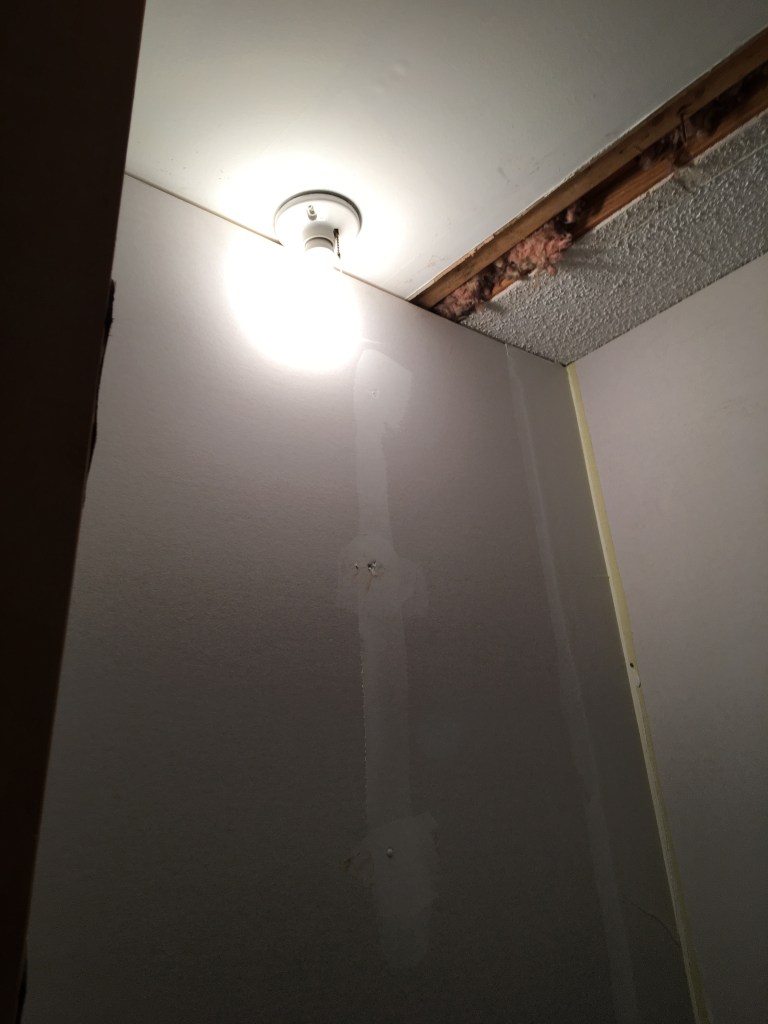 The first 2 pictures below show the doors to Clara’s old closet. The 2nd one shows what I mean by the bump out. The 3rd picture shows what would be the entrance to the new closet in Gray’s room. The 4th-7th pictures show how the ceiling for Chris’s office looked once the closets were combined. We did have the light centered. The 8th picture shows the new closet in the playroom.