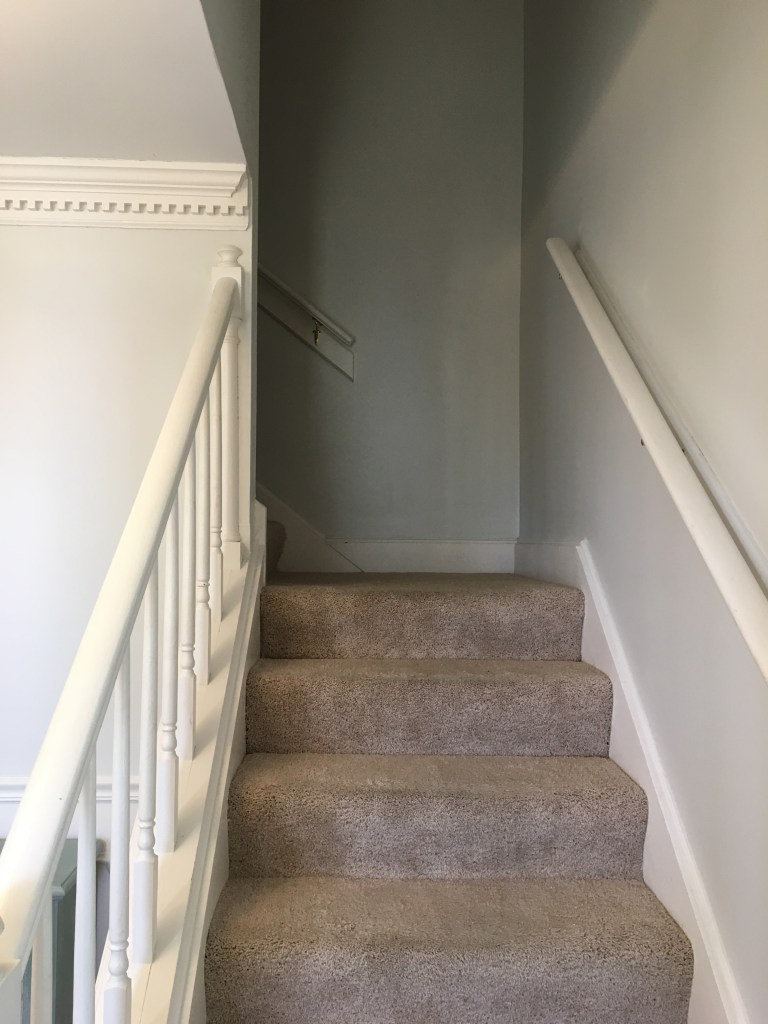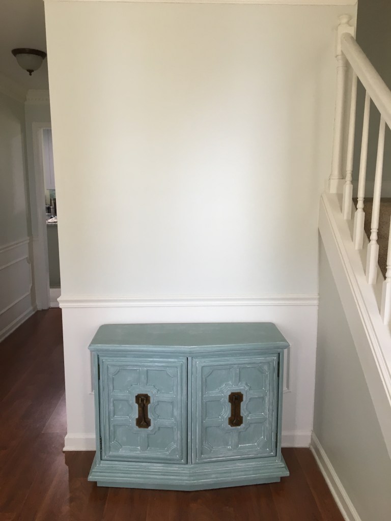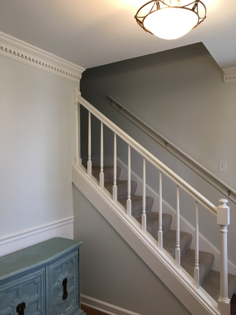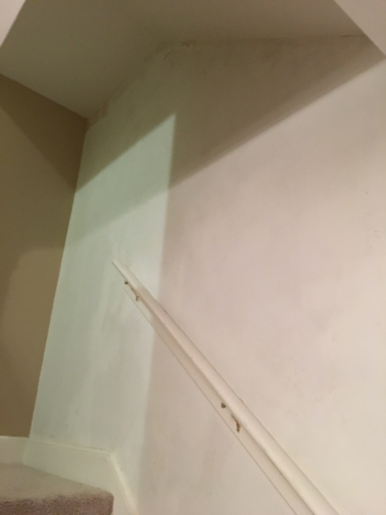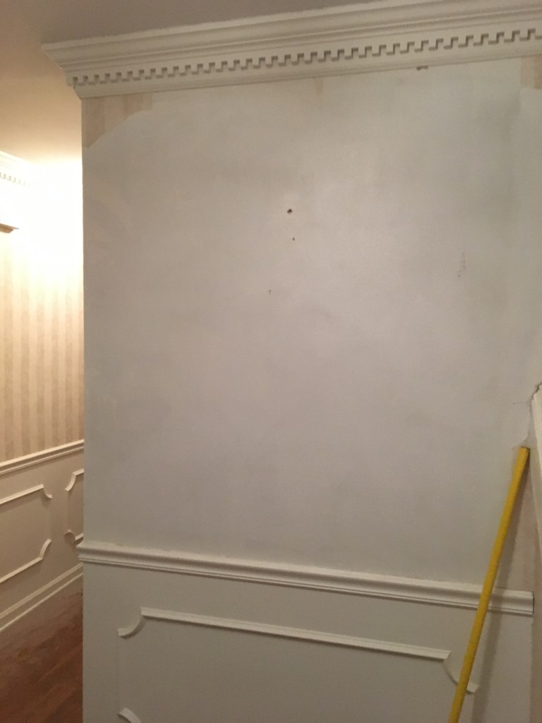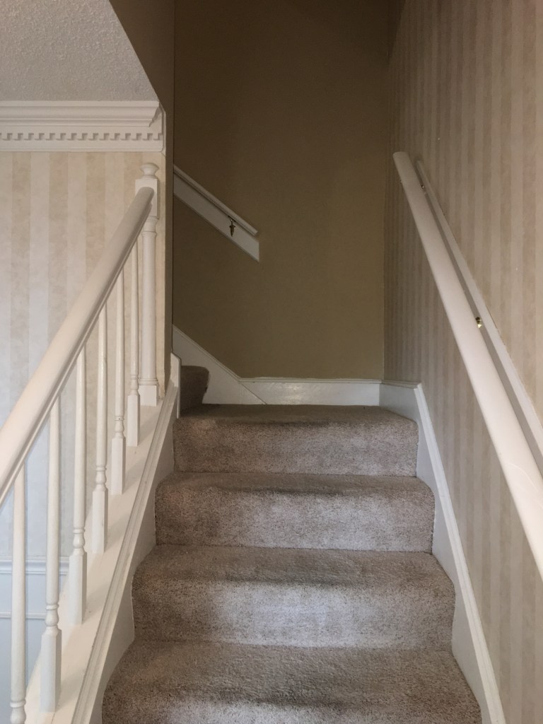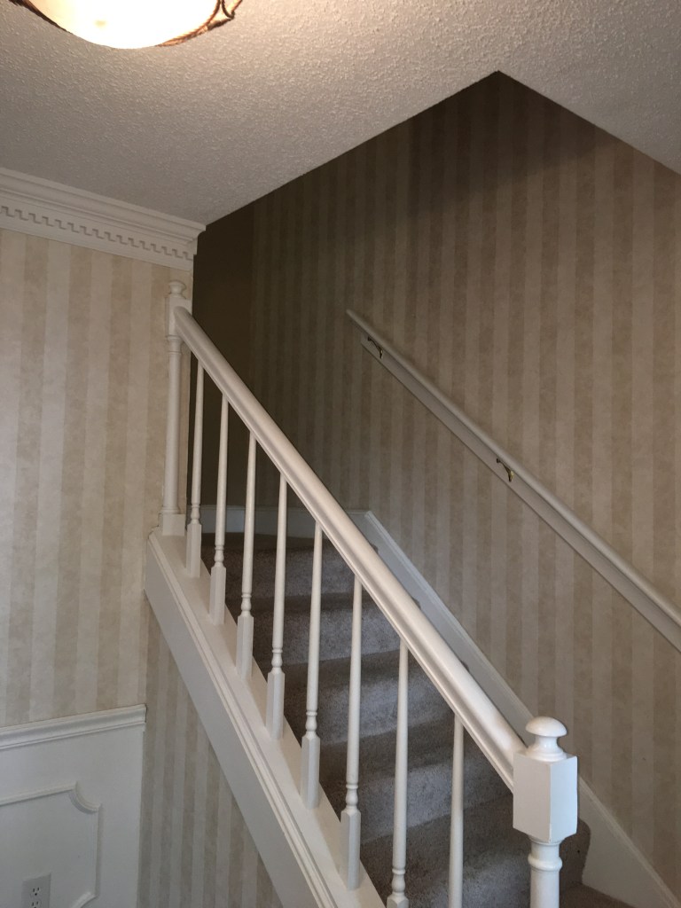 As I am certain I have mentioned in other posts, we did not move into our current home immediately after buying it. I wanted to have a somewhat functional kitchen before moving in which had us living with my in-laws while the kitchen was redone. However, there were times that one of us had to be here while work was being done. This was true for when the kitchen cabinets were being installed. They wanted us here in case there were any questions and I wanted to be here as much as possible since I was beyond excited to see the kitchen being put back together. Since we had moved our boxes that were not immediate needs (clothes and the like) into the home in piles as far away from the kitchen as we could get them and there was also construction dust everywhere, the home was feeling anything but homey. We also didn’t have internet set up. So while hanging out here while the cabinets were installed there really wasn’t much to do. I discovered a loose piece of wallpaper in the foyer/stairwell and decided what better time then now to remove the wallpaper. At first it came off very easily and I quickly took a good portion down. After a while things did get harder and I had to work to get the remaining pieces off. There was some wall repair needed afterwards, but nothing too terrible. Overall, I think it was a great use of my time. Also as I point out in captions below, sometime between me starting to remove the wallpaper and the after photos Chris smoothed the ceilings. I am a huge believer in smoothing ceilings. It really lightens and brightens up a space!